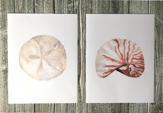 Image Of Sand Dollar And Nautilus Shell Set Of 2 Prints Watercolor Coastal Seashells Tropical Nautical Wall Art Archival Paper Linen Paper