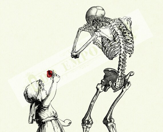 Image Of Halloween Girl Art Print Sad Skeleton Reaper Death Red Rose Victorian Steampunk Gothic Art Print