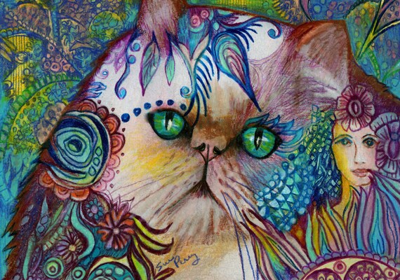 Image Of Original Art Drawing 9x5 Himalayan Cat Zentangle Art Nursery Wall Decor Colorful Feline